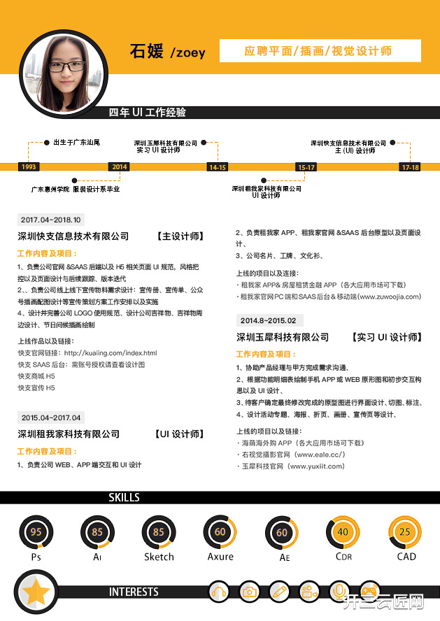 学设计出生,有四年设计经验~审美 色彩敏锐 板式设计 沟通 速度都有优势!可胜任 UI视觉/平面/品牌VI/吉祥物/插画等设计;如果您需要一位全方位的设计师,找我就对了呢!